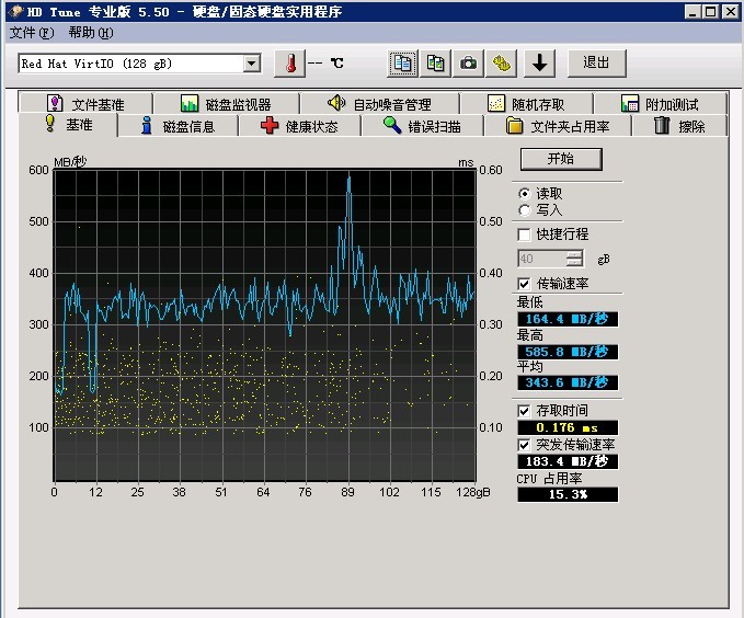 吞吐量主要指大文件的连续读写速度,在大文件的复制、备份等场景适用,用“HD Tune专业版”中的“基准”测试功能即可测试出磁盘的吞吐量,一般传统机械sata硬盘的顺序读写速度为 :80~150M/s, SAS硬盘为150~200M/s,SSD固态硬盘为400~600M/s。